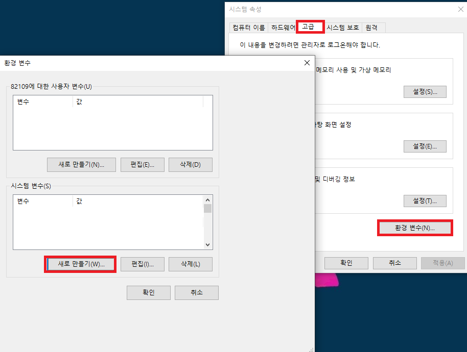 먼저 시스템 환경 변수 편집 창을 킨다.